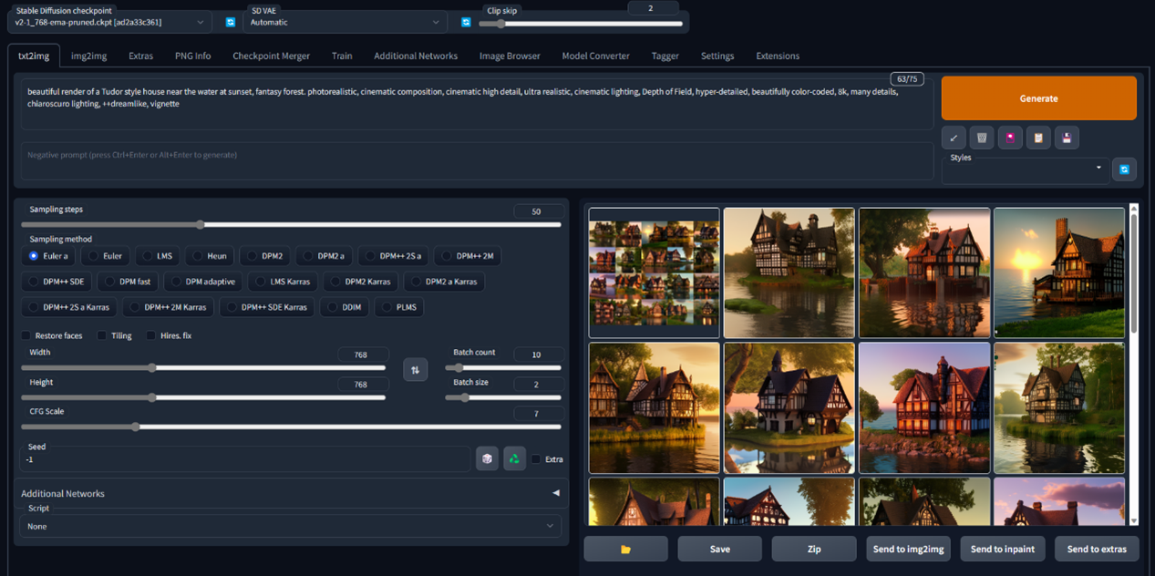 这里我们利用一段固定的文字描述来引导为我们创建20张符合描述的建筑风景图片。在UI界面中设置GeForceRTX4060Ti同时运算2张图片,总共运行10次,即20张。每张图片分辨率为768x768分辨率,采样步数设置为50。