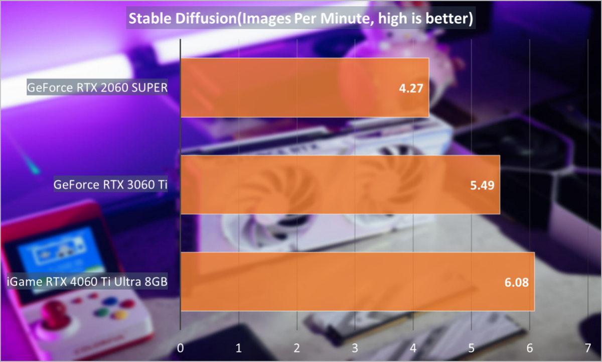 通过比较,并记录下每个GPU花费的时间,并进一步推算出每分钟生成的图像效率(ImagesPerMinute)。可以看到iGameRTX4060TiUltraWDUOOC8GB相对GeForceRTX3060Ti和GeForceRTX2060SUPER在的AI效率分别提升了10%和42%,表现大致与GeForceRTX3070Ti持平。
