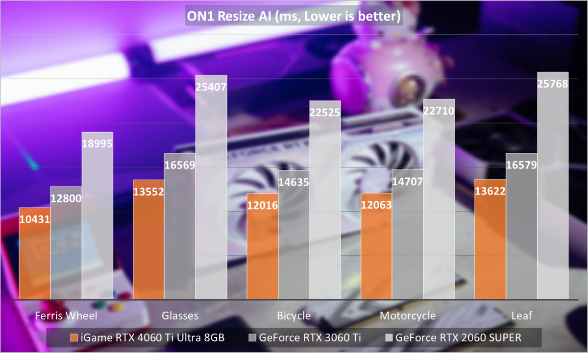 同样,在利用ON1ResizeAI2022提升图片的原生分辨率测试中,iGameRTX4060TiUltraWDUOOC8GB相对GeForceRTX3060Ti节省了18%左右的时间,相对GeForceRTX2060SUPER节省了将近46%的时间。