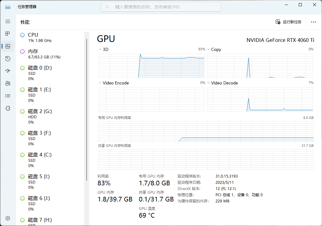 当然开启RTXVSR也是有代价的,在运行状态下会明显发现GPU占用率达到83%,这时候就不能指望iGameRTX4060TiUltraWDUOOC8GB还可以分心做其他事情了。