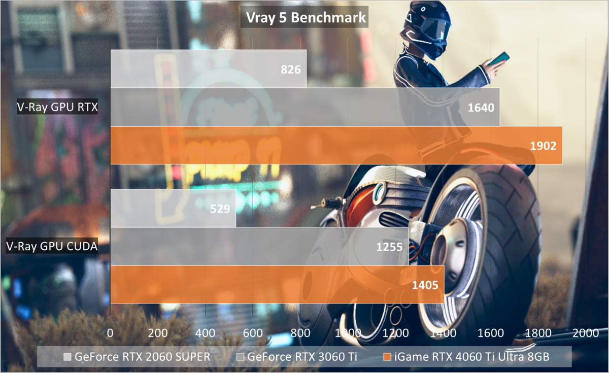 最后是iGameRTX4060TiUltraWDUOOC8GB的创作性能测试。这里先围绕iGameRTX4060TiUltraWDUOOC8GB的渲染输出进行测试,例如V-Ray5Benchmark中,会分别对CUDACore和RTX进行检测。