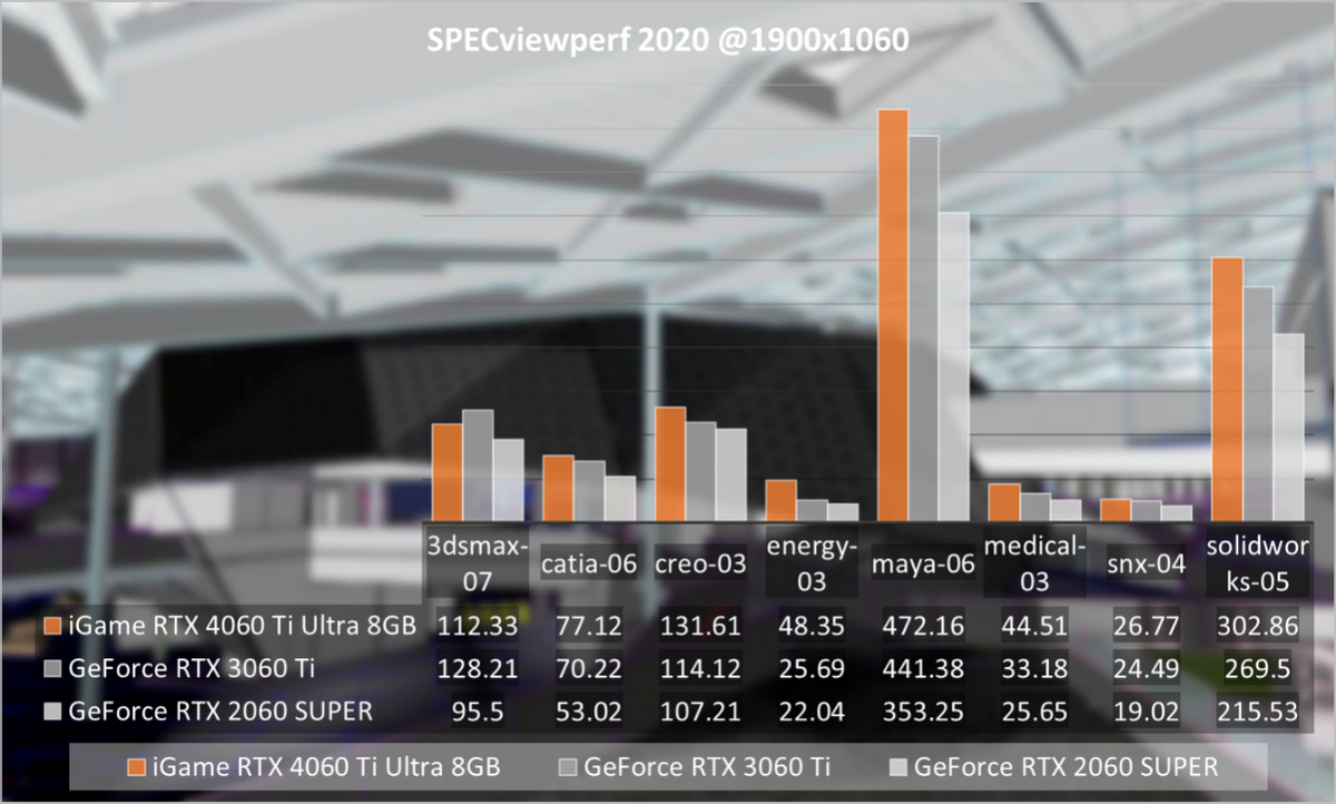 工程专业常见的SPECviewperf2020。这是一款包含能源勘探、医学、建筑设计、机械设计、汽车设计、飞机设计领域的专业软件图形测试,包括包括3dsmax、Catia、Creo、Energy、Maya、Medical、SNX、Solidworks等主流软件。能够看到GeForceRTX4060Ti8GB相对GeForceRTX3060Ti平均提升9%,相对GeForceRTX2060SUPER平均提升27%。