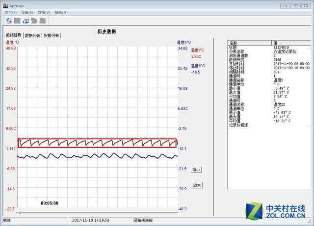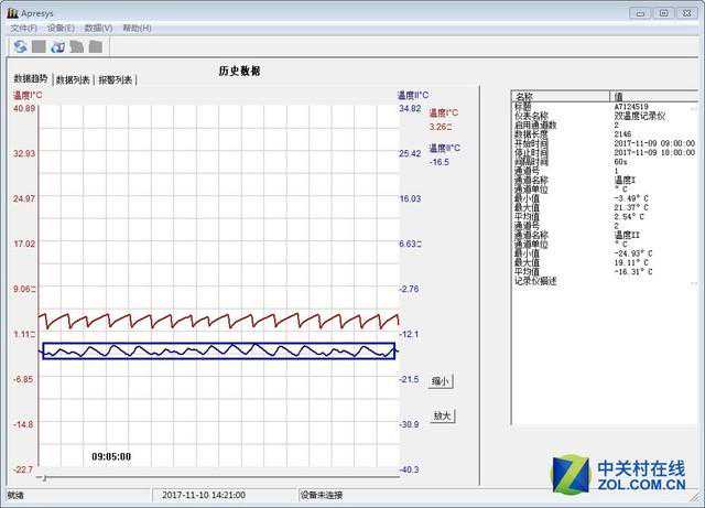 注:测试所使用的智能温度记录仪型号为APRESYS179-T2。测量范围从–55℃到125℃,测量精度±0.3℃,分辨率0.01℃,采用两个温度探头传感器,同时记录温度变化。