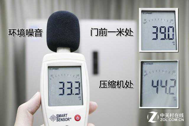 通过测试,环境噪音为33.3db,冰箱前门1米处的噪音为39.0db,压缩机处噪音为44.2db,相对略高。结合噪音级别数值表来看,其中30-50db为普通室内噪音范围,这款冰箱产品在噪音控制方面整体表现不错,即使冰箱在满功率运转状态,也不会对用户的生活造成影响。