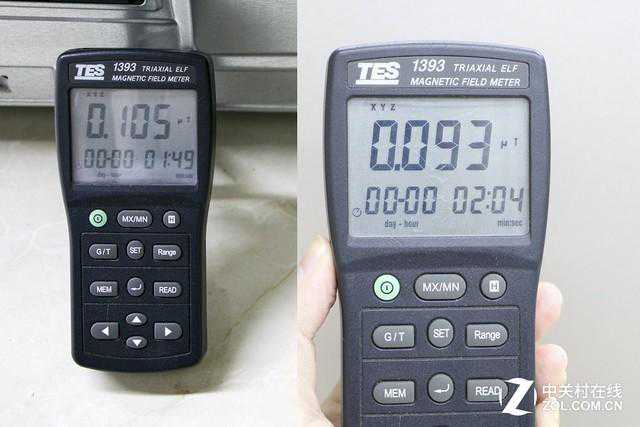 辐射工频段的单位是μT,辐射值在0.4μT以下,对人体危害微乎其微。通过测试,我们测得,冰箱前门处的辐射强度为0.093μT,冰箱压缩机处辐射强度为0.105μT。无论是前门还是压缩机处的辐射强度都远远低于安全值,所以这款冰箱的在辐射方面不会产生任何安全问题。