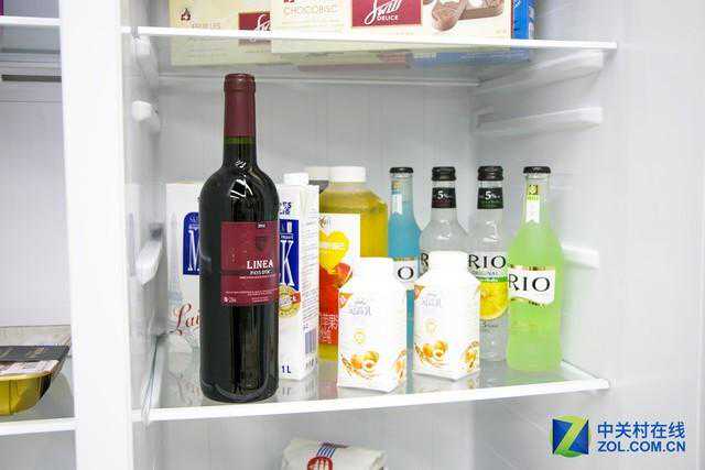 作为一台对开门冰箱,整体容积大、竖向空间较大是其最大的空间优势,这样的空间布局便于放入大量食材,分层结构在能够放入大量食材的同时,更好的保证冰箱中的空间利用率,减少空间的浪费;可拆卸的隔板能够自行搭配数量和位置,让冰箱的空间自由度更高,便于放入超大超高体积的食材,在我们的测试中,即使红酒瓶这种超高体积的物品都能轻松放置。