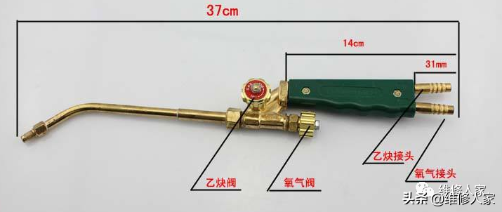 2)使用焊枪前,应将红色氧气胶管套在焊炬的氧气进气口上,用铁丝扎紧。点火时,先将焊枪上的氧气阀调至最小,然后慢慢开启焊炬上的液化气阀,最后再点燃。熄灭时,必须先关闭焊枪上氧气调节阀门,再关闭乙焼气调节阀门。