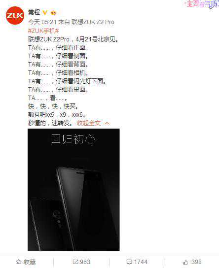 4月14日早上,ZUK总裁常程在微博曝光一张海报,海报主题为“回归初心”,海报还有展示一款手机,很有可能就是即将发布的ZUKZ2Pro,从图中可以看出该机配备有2.5D屏幕,而在机身背部除了镜头和闪光灯外,还有一个部件具体是什么功能目前还不得而知。
