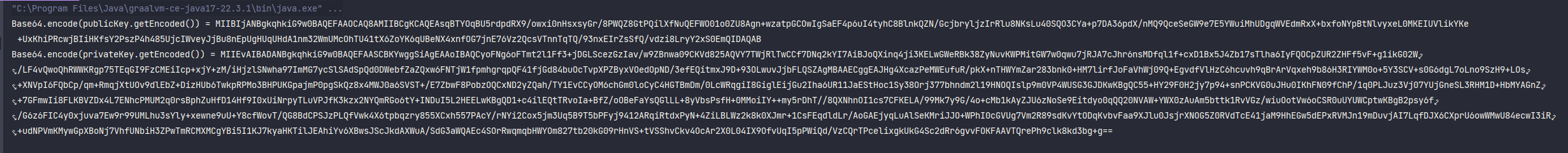//生成RSA密钥对KeyPairGeneratorkeyPairGenerator=("RSA");(2048);KeyPairkeyPair=();RSAPublicKeypublicKey=(RSAPublicKey)();RSAPrivateKeyprivateKey=(RSAPrivateKey)();("(())="+(()));("(())="+(()));