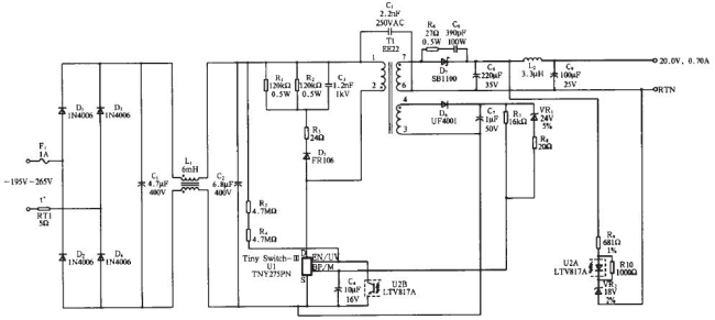 输入整流滤波电路包括整流部分、交流滤波和直流滤波电路。为了抑制电网中的浪涌电流,输入端口串联了1A保险管F保护电路和负温度系数热敏电阻RT1(NTC)。交流滤波采用π型滤波电路,电容C1、C2和共模扼流圈L1。共同作用滤除杂波去除电网中的干扰,共模扼流圈(电感)是由两股等同并且按同方向绕制在一个磁芯上的线圈组成。当负载电流流过共模扼流圈时,串联在火线上的线圈所产生的磁力线和串联在零线上线圈所产生的磁力线方向相反,它们在磁芯中相互抵消。因此即使在大负载电流的情况下,磁芯也不会饱和。而对于共模干扰电流,两个线圈产生的磁场是同方向的,会呈现较大电感,从而起到衰减共模干扰信号的作用。