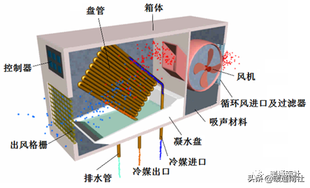 风机盘管的结构:风机盘管由风机、风机电动机、盘管、空气过滤器、凝水盘、室温控制器和箱体等构件组成。