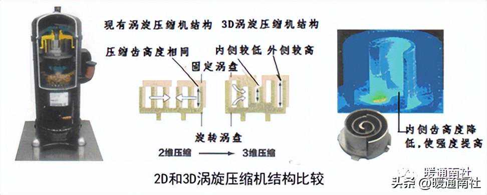 2D涡旋式的,定涡旋盘与动涡旋盘的涡旋齿高度相同,涡旋压缩机利用旋转运动以及由端板和涡旋齿构成的动、定涡旋盘之间的相互离心作用来对制冷剂进行压缩,由于涡旋齿的高度在整个压缩过程中保持不变,因而只有从外侧和内侧对制冷剂进行的二维压缩。