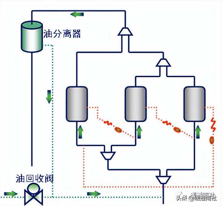 利用油的自动回流将油输送回各个压缩机内,保证压缩机需要的油量。