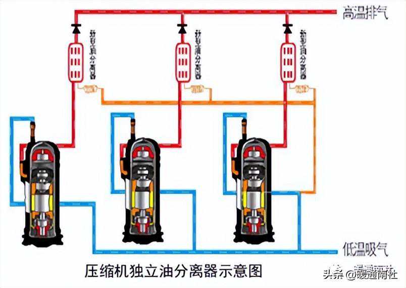 变频压缩机系统一般采用独立油分离器,即每个压缩机一个油分离器。