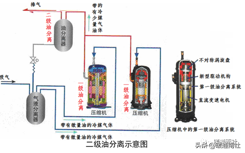 数码涡旋压缩机卸载时不排油,并且压缩后的高温高压冷媒气体不经过底部的冷冻油积聚区,不会加热冷冻油引起冷冻油气化量增大而增大排油量,因此,数码涡旋系统一般设有一个高效油分离器,截流压缩机负载时排出的冷冻油,并将冷冻油沿油管返回到各压缩机中。