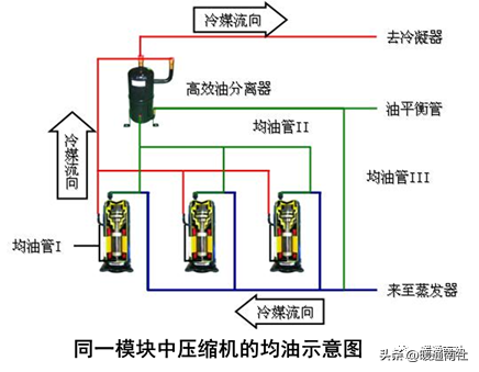 一般是采用均油管或油平衡管的方法达到油在不同压缩机间或不同模块间的平均分配,从而保证了压缩机供油充足均衡,延长空调整机的使用寿命。