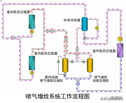 喷气增焓系统,是由喷气增焓压缩机、喷气增焓技术、中间冷却器组成的新型系统,这三个技术的组合可提供高效的性能。