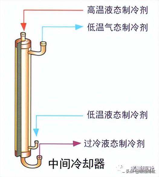 一方面,对主循环回路冷媒进行节流前过冷,增大焓差;另一方面,对辅助回路(此路冷媒将由压缩机中部导入直接参与压缩)中经过电子膨胀阀降压后的低压低温冷媒进行适当的预热,以达到合适的中压,提供给压缩机进行二次压缩。