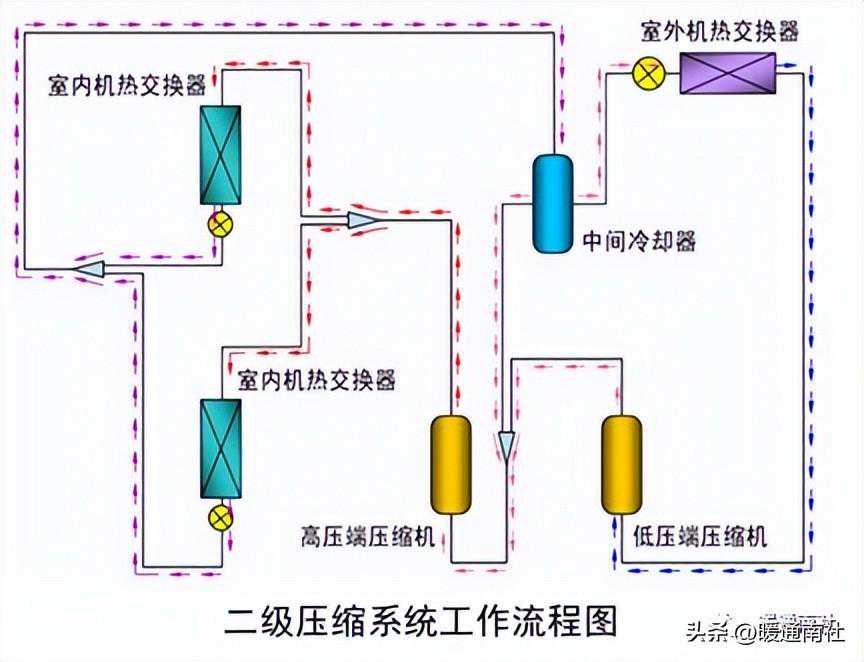 二级压缩指的是在2台压缩机之间设置中间冷却器和旁通回路,使每个压缩机分别进行有效的压缩,使得设备在室外温度很低的条件下也能实现高效的制热运转。