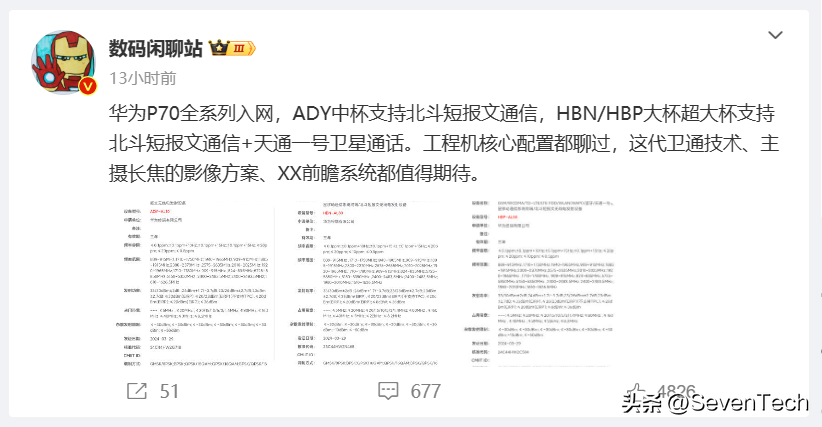 “华为P70全系列入网,ADY中杯支持北斗短报文通信,HBN/HBP大杯超大杯支持北斗短报文通信+天通一号卫星通话。工程机核心配置都聊过,这代卫通技术、主摄长焦的影像方案、XX前瞻系统都值得期待。”