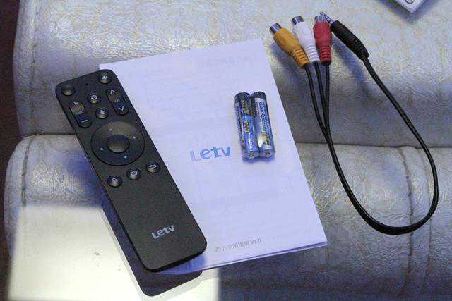 乐融LetvY65超级电视的全套配件干净零落,分别是16键的蓝牙语音遥控器,两节7号电池和一根转接线。