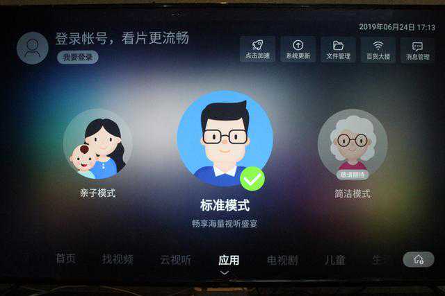3、简洁模式:这其实更应该叫长辈模式,界面设计及交互非常简单易懂,适合刚接触智能电视的父母使用。