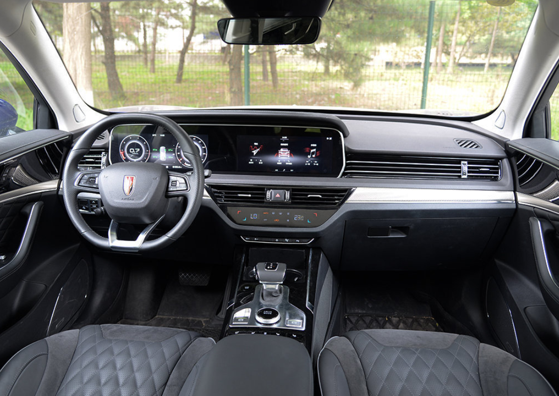 坐进车内,红旗HS5的内饰设计比较有特点,中控台配备尺寸达到12.3英寸的连体双屏,且红旗HS5的空调系统也选择触控面板,整套搭配下来虽说原创度不高,但科技感确实不错,该车的档把跟大多数车型都不太一样,整体造型比较宽大,手小的女生可能没办法一只手握持,但握持感确实不错,门板内侧选择了皮革软包,并且自带了菱形图案,兼顾了高级感也提升了品味。