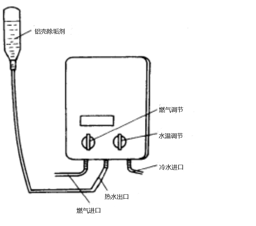 (3)点燃热水器常明小火,对除垢液加温,待10~15min后,关闭常明小火,打开水温开关,将饮料瓶中剩下的除垢液全部流入热水器并从进水口排出(可重复几次)。