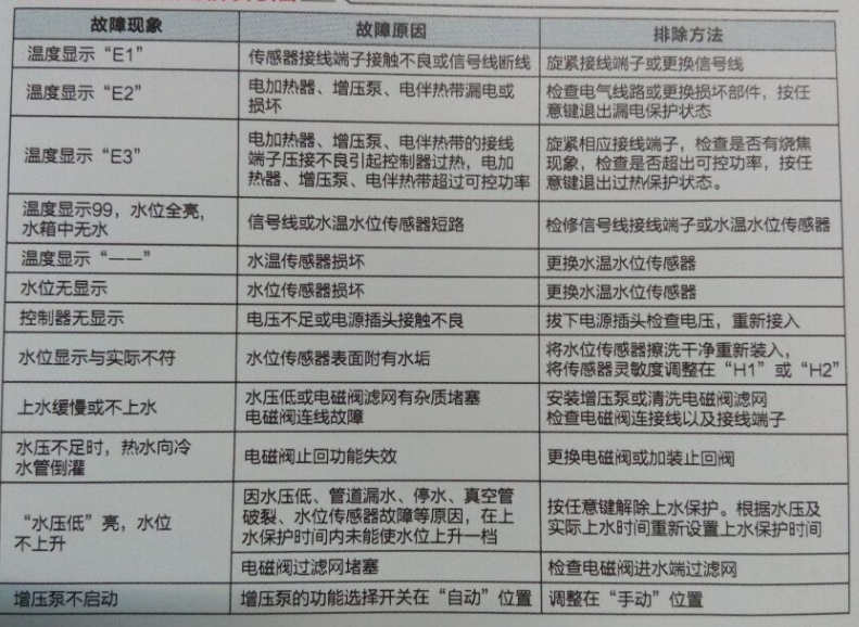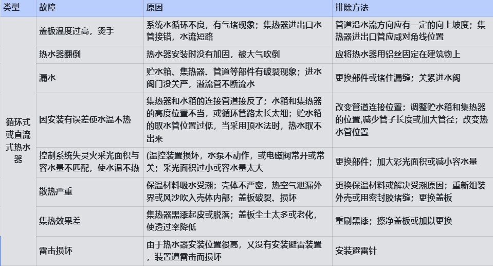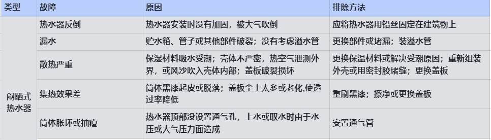 一、太阳能热水器的常见故障及排除方法见下表。