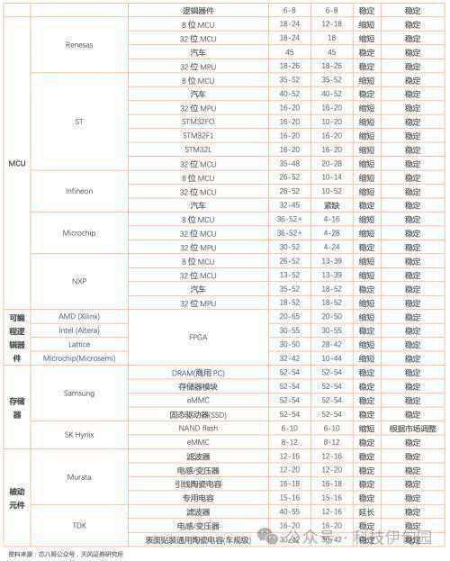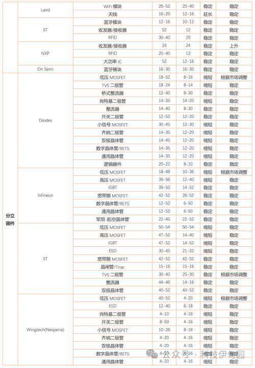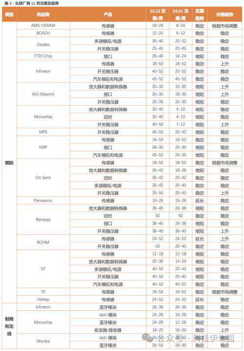 重点芯片供应商交期:从12月各供应商看,交期缩短趋势尤为明显。其中,模拟芯片降幅较大,价格倒挂严重;DRAM和NAND等存储芯片价格持续回升;MOSFET/IGBT等功率器件改善明显;MCU价格趋于稳定。