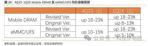 2024年一季度存储价格预判:24Q1整体存储市场价格展望乐观,其中MobileDRAM及NANDFlash(eMMC/UFS)均价季涨幅将扩大至18~23%。2024年第一季存储器价格走势在客户端需求持续,以及原厂仍未拉升稼动的情况下,供需缺口加大,Mobile存储器涨幅将较其他应用更明显,将成为该季领涨项目。