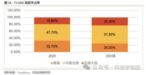 DDIC随着2023年价格基本稳定或略有下降,随着电视、游戏显示器和商用笔记本电脑等大型应用出货量回升带动DDIC需求增加。但由于持续的市场压力,DDIC价格预计将继续呈下降趋势。中国工厂的面板生产日益集中,使长期主导DDIC市场的中国台湾供货商面临巨大压力。根据Trforce数据,2022年至2023年,中国大陆TVDDIC市场份额持续增加,从19.6%提升至23.3%。