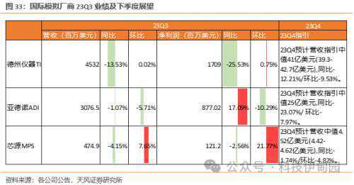国际大厂23Q3收入同比持平/微增,23Q4展望营收或环比下行。国际模拟芯片大厂TI、MPS近期发布23Q3季报,各大厂商业绩在各自的下游应用领域表现均呈现分化的态势,TI的模拟领域营收为33.53亿美元,同比-16%,嵌入式处理领域实现营收8.9亿美元,同比+8%。