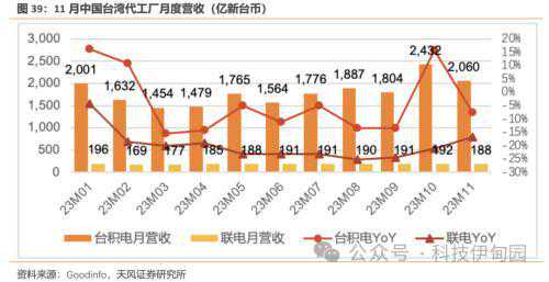 根据ictimes数据,台积电在2023年11月的合并营收约为2060亿元新台币,较上月减少了15.3%,与去年同期相比,也呈现了7.5%的下滑。台积电总裁魏哲家表示,PC与手机上出现的一些早期复苏迹象;然而,目前仍很难断定是否会出现强劲的复苏,因为客户仍在谨慎地管理库存。根据C114通信网数据,联电2023年11月营收环比下降2.1%,同比下降16.7%,至187.9亿元新台币。联电公司联席总裁JasonWang表示,计算机和通信领域的短期需求正在逐渐恢复,而汽车市场的状况仍然充满挑战,客户继续采取谨慎和保守的态度来管理库存水平。