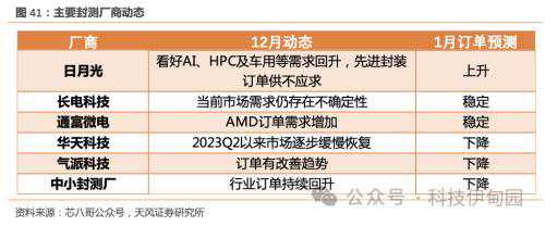 12月,先进封装需求供不应求,行业复苏趋势明显。根据芯八哥预计,日月光看好AI、HPC及车用等需求回升,先进封装订单供不应求,12月产能利用率达65%,预计1月订单持续上升。长电科技12月产能利用率约80%,预计1月订单维持稳定。通富微电AMD订单需求增加,12月产能利用率达85%,预计1月订单维持稳定。华天科技2023Q2以来市场逐步缓慢恢复,12月产能利用率也达到85%。