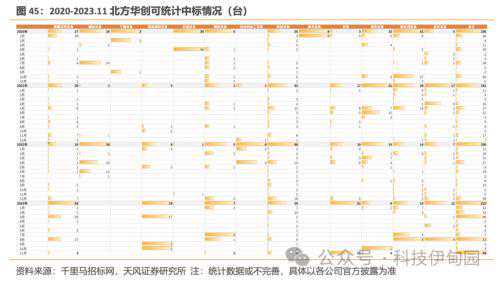 2023年11月,北方华创可统计中标设备69台,同比1380%,包括3台薄膜沉积设备,2台溅射设备,9台刻蚀设备,4台清洗设备,51台其他设备。