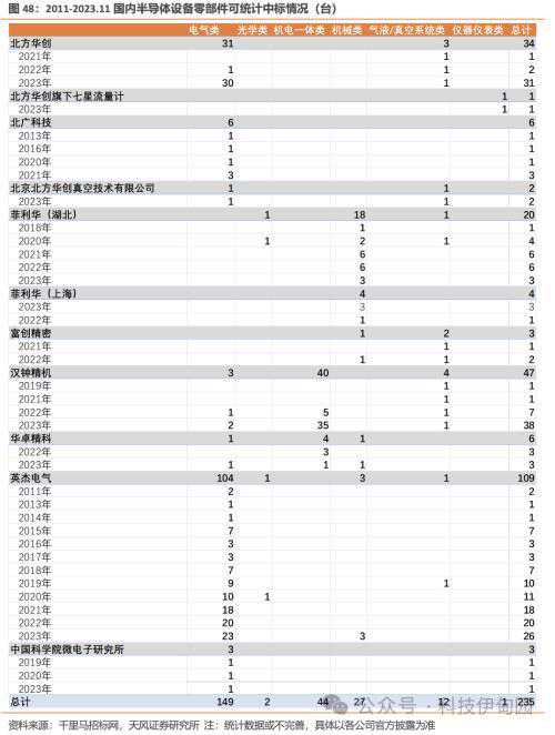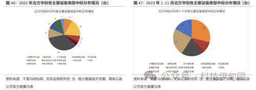 2023年1-11月,北方华创可统计中标设备215台,同比39.61%。其中,薄膜沉积设备62台,同比+688.89%;高温烧结设备19台,同比+137.50%;溅射设备7台,同比+133.33%;刻蚀设备39台,同比-18.75%;清洗设备6台,同比-57.14%;热处理设备19台,同比+58.33%;真空设备12台,同比+140%。