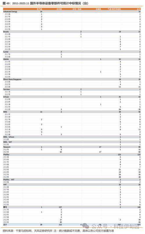 2023年11月,国外半导体零部件可统计中标共26项,同比+18.18%。主要为光学类17项,机械类3项,气液/真空系统类6项。分公司来看,蔡司可统计中标零部件最多,为12项,Pfeiffer3项,Newport7项,MKS2项,Inficon2项。