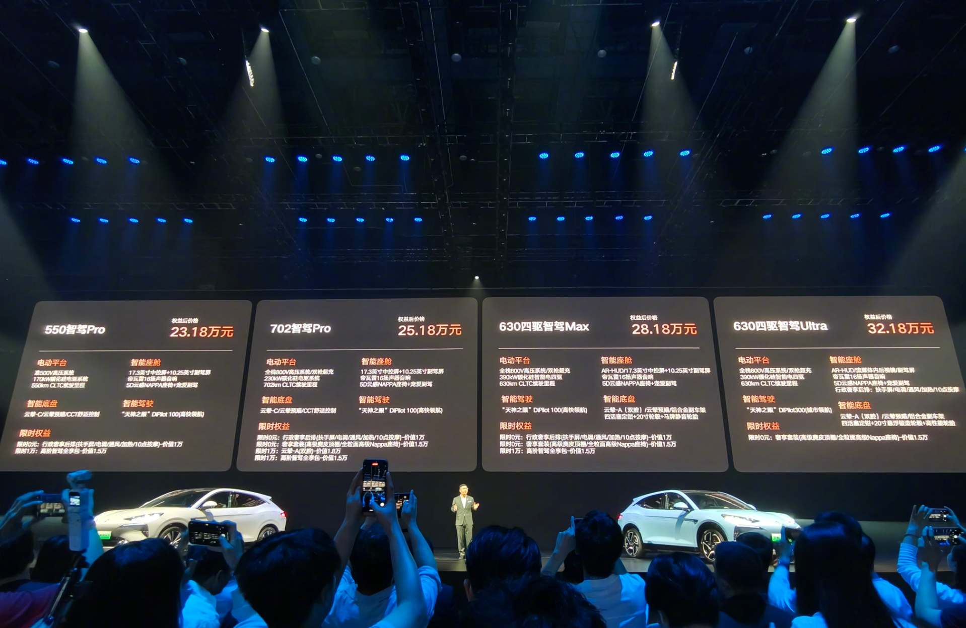 动力方面,单电机版提供最大功率170千瓦和230千瓦两种不同功率调校,双电机四驱版最大功率分别为160千瓦和230千瓦,CLTC工况下续航里程有550km、702km、630km(四驱)三种选择。底盘方面,配备智能底盘融合技术以及云辇-A智能空气车身控制系统等技术,单腔空悬升级为双腔空悬。