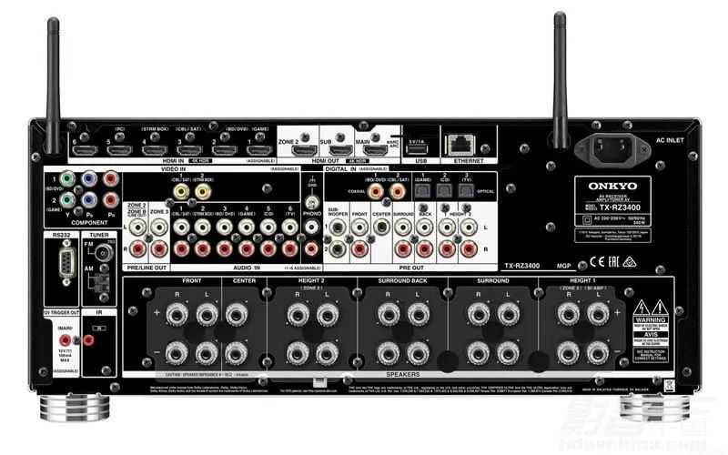 输入接口:HDMI(7进3出)、RCAVideo×2、RCAAudio×6、RCA(Phono)、同轴×2、光纤×3、USB、LAN
