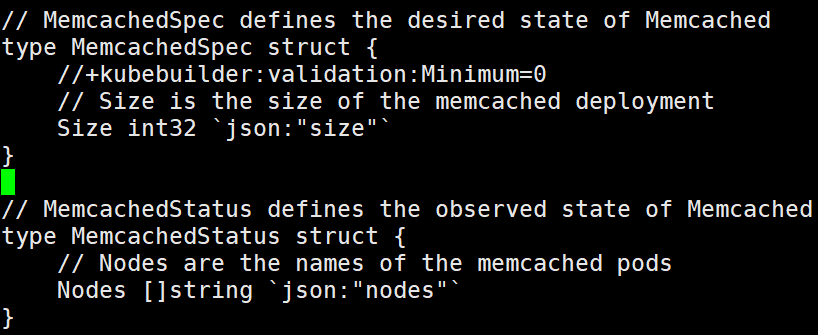 接下来修改api/v1alpha1/memcached_中的Go类型定义,为Memcached自定义资源(CR)定义API,使其具有以下规格和状态:
