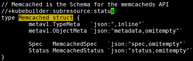 //MemcachedistheSchemaforthememcachedsAPI//+kubebuilder:subresource:status//增加此行typeMemcachedstruct{`json:",inline"``json:"metadata,omitempty"`SpecMemcachedSpec`json:"spec,omitempty"`StatusMemcachedStatus`json:"status,omitempty"`}
