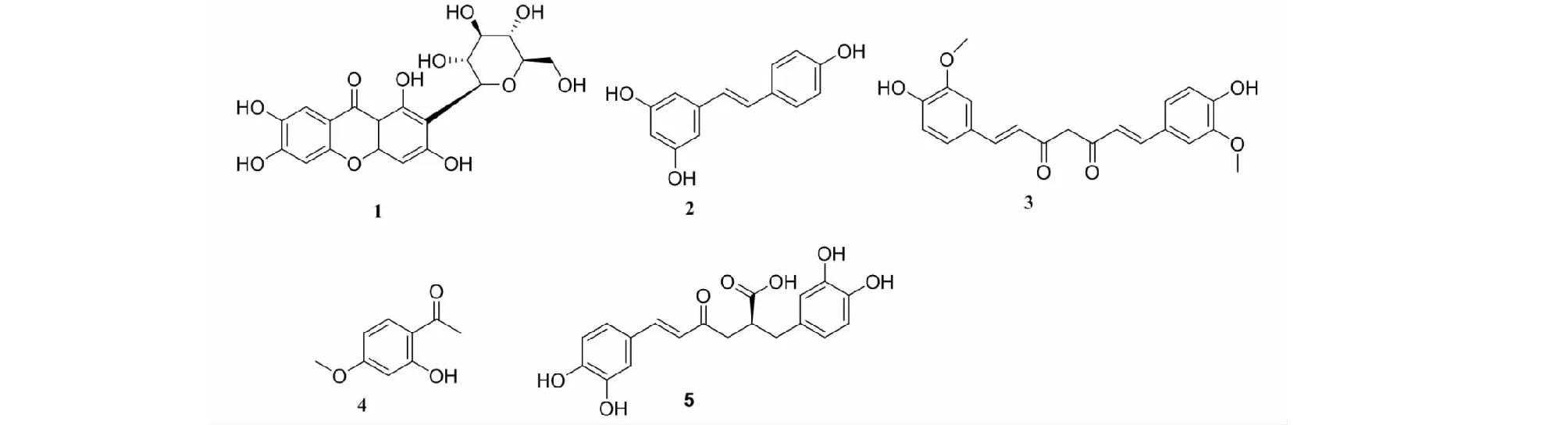 芒果苷(mangiferin,1)(见图1)是中药知母的主要活性成分。可通过抑制PI3K/Akt/mTOR通路,增加脑组织中超氧化物歧化酶(superoxidedismutase,SOD)的含量及p-PI3K、p-AKT、p-mTOR的表达,抑制缺氧缺血性脑损伤大鼠的细胞凋亡及炎症反应[9]。