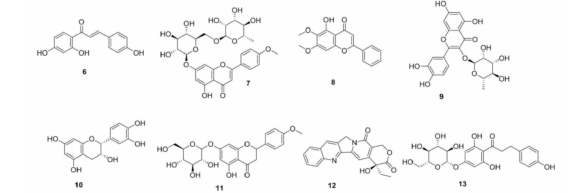 三叶苷(trilobatin,13)是从多穗柯(甜茶)嫩叶中提取得到的二氢查尔酮类化合物,具有抗氧化、抗炎和抗糖尿病等活性,常被用作天然甜味剂。Wang等[22]研究发现,三叶苷可上调miRNA-539-5p表达,从而有效降低缺氧缺糖诱导的心肌细胞损伤。