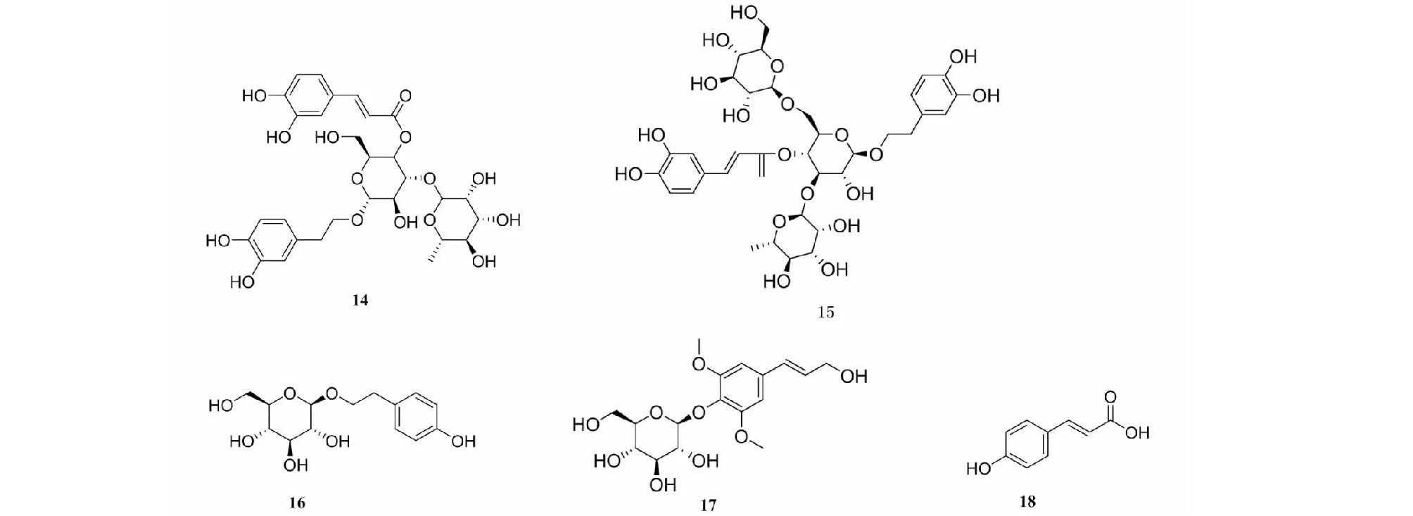 对香豆酸(p-hydroxycinnamicacid,18)是一种广泛存在于人参、红花、菟丝子等多种中药中的苯丙酸,具有抗氧化、抗炎、保护心脏和免疫调节等作用。