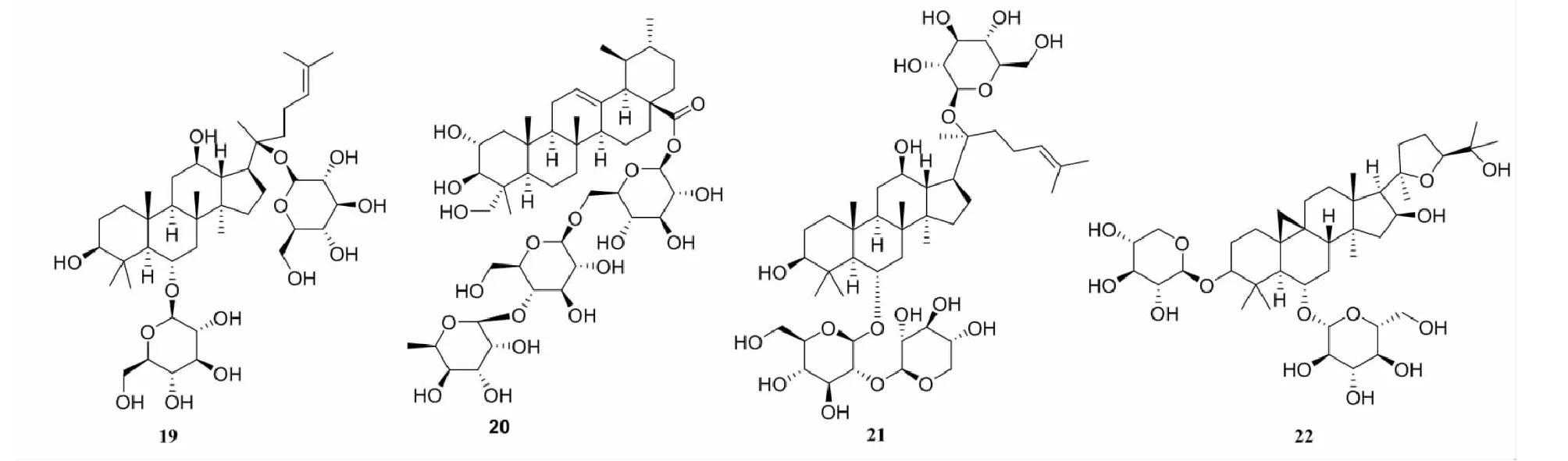 人参皂苷(ginsenoside,19)(见图4)是人参中主要的药理活性成分之一,其中人参皂苷Rg1是关键的生物活性成分,可抑制H/R导致的心肌细胞凋亡和caspase-3的活性,促进核因子红细胞2相关因子2(nuclearfactorerythroid-2relatedfactor2,Nrf2)核转录,同时可增强下游基因HO-1表达,通过激活Nrf2/HO-1信号通路保护心肌细胞[30]。