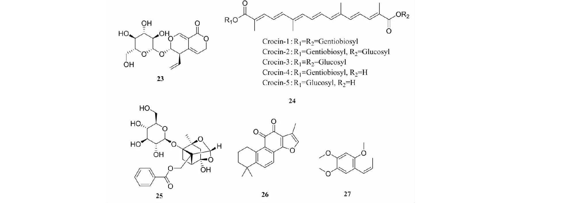西红花苷(crocin,24)是西红花的主要活性成分之一,能通过上调Bcl-2表达,下调Bax和caspase-3表达,抑制缺血缺氧损伤大鼠的心肌细胞凋亡,进而缓解心肌组织氧化应激损伤[35]。