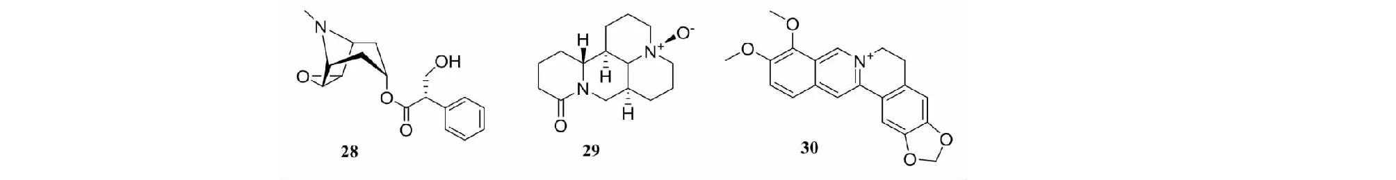 东莨菪碱(scopolamine,28)(见图6)是中药洋金花中的指标性成分,为M胆碱受体阻断药,临床可有效改善新生儿缺血缺氧性脑病患儿的临床症状,对重型颅脑损伤也有保护作用。Wang等[39]研究发现,东莨菪碱可下调Bax及上调Bcl-2的表达,抑制H/R诱导的心肌细胞凋亡,降低MDA、LDH和CK水平,减轻H/R诱导的心肌细胞氧化损伤,通过调控微小RNA-15b的表达而抑制PI3K/Akt信号通路的活化从而保护H/R损伤的心肌细胞。