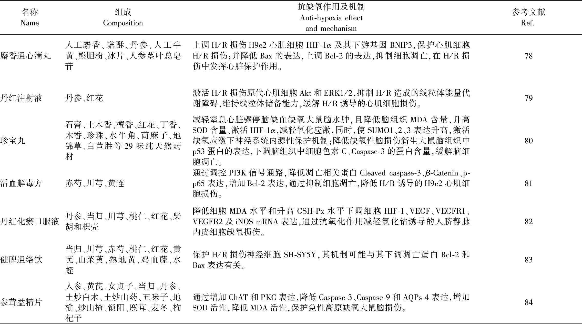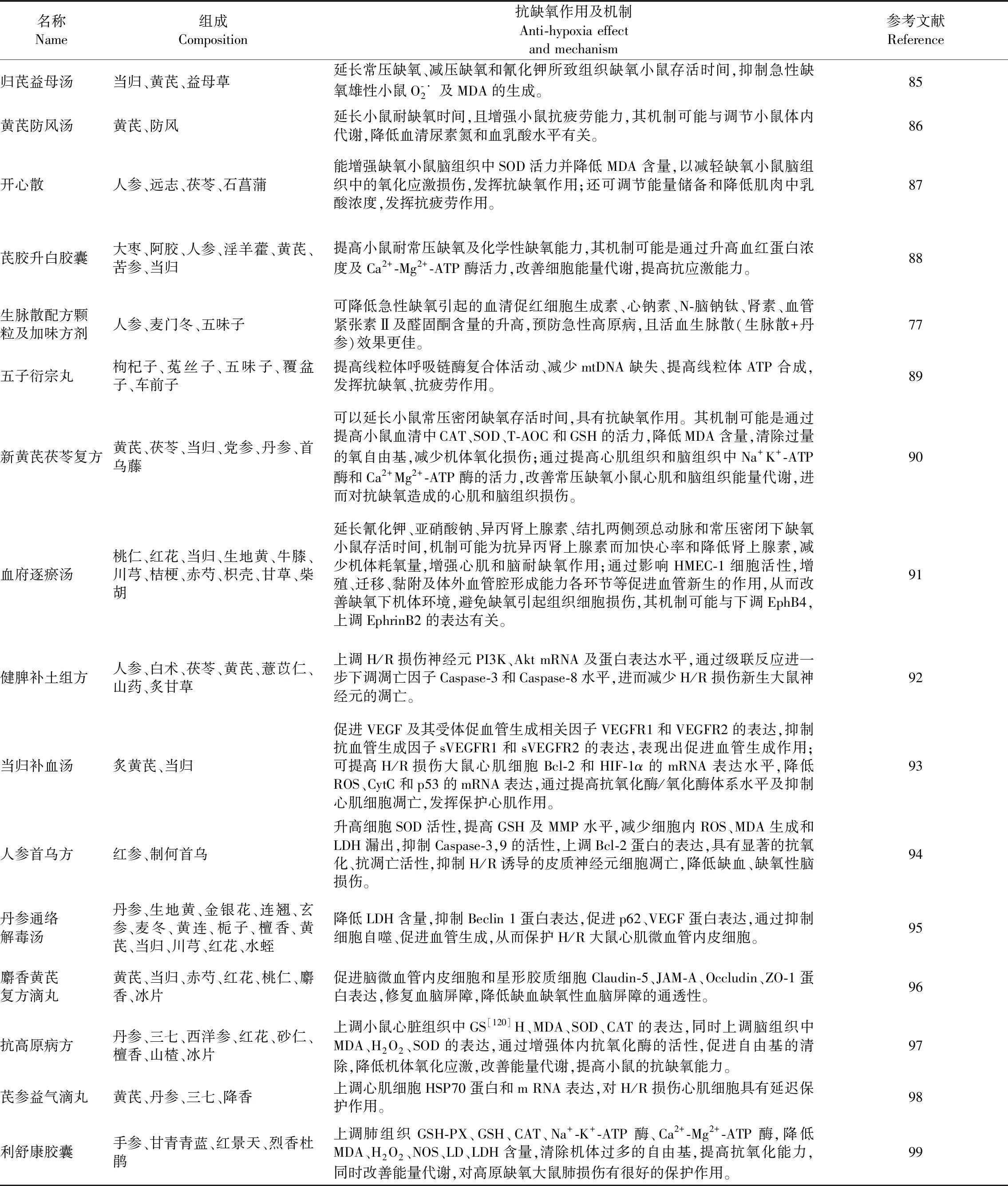 中药复方是由两味或两味以上药味配伍组成,其以低毒、高效、安全的优势在抗缺氧损伤的药物研发中发挥着重要作用。复方中不同药物的化学成分协同作用于机体,可以多靶点、多层次发挥抗氧化、抗凋亡和调节细胞能量代谢等作用,改善由缺氧引起的机体各部位损伤,继而抑制缺氧相关疾病的发生发展。如生脉散可降低急性缺氧引起的血清促红细胞生成素、心钠素、N-脑钠肽、肾素、血管紧张素Ⅱ及醛固酮含量的升高,从而预防急性高原病[77]。相关抗缺氧中药复方及其作用机制见表1。