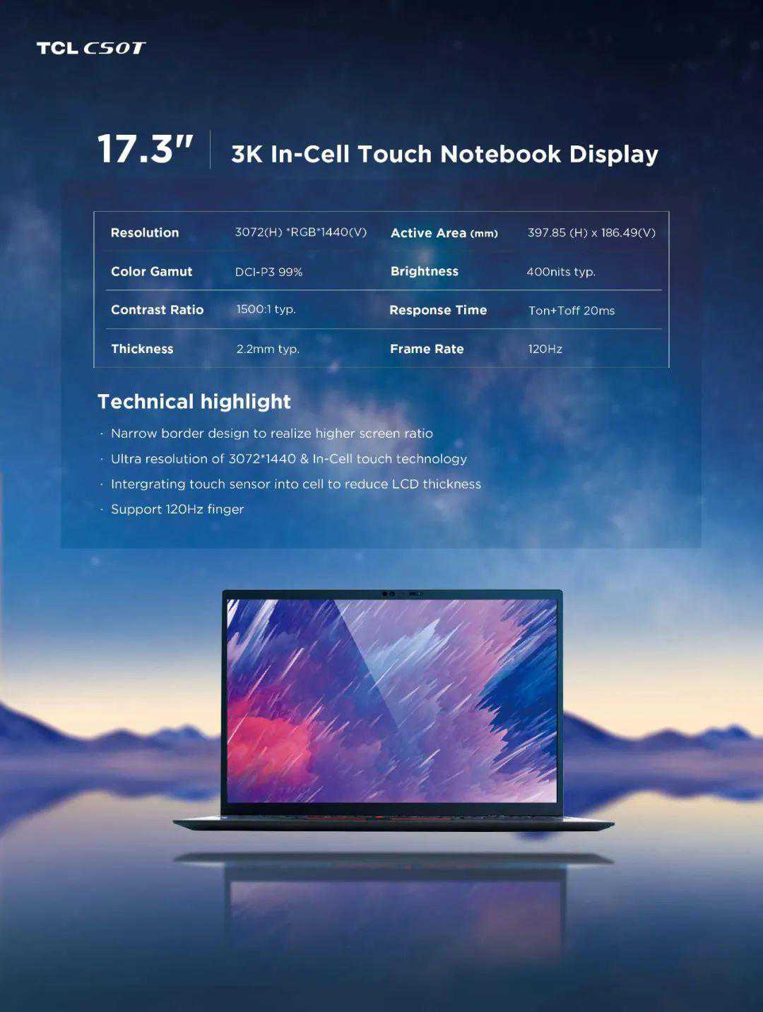 TCL 展示17.3 英寸笔记本屏:3K 120Hz 触控,99% DCI-P3 色域